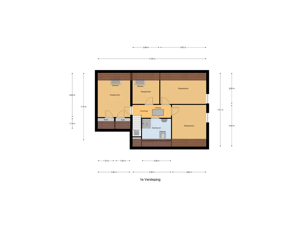 Hier tref je 4 ruime slaapkamers waarvan 1 met vaste kasten. De badkamer is voorzien van douche, toilet en wastafel.